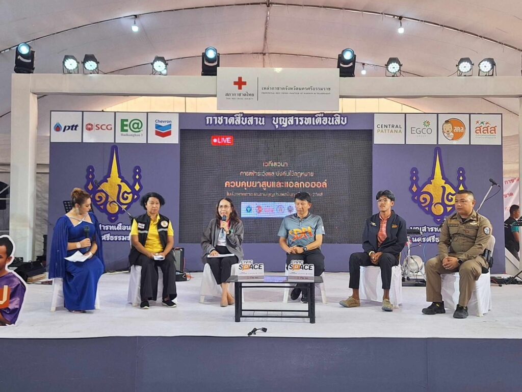 จังหวัดนครศรีธรรมราช ร่วมกับสำนักงานกองทุนสนับสนุนการสร้างเสริมสุขภาพ (สสส.) เครือข่ายองค์กรงดเหล้า หน่วยงานสาธารณสุข ศึกษาธิการ ภาคีเครือข่ายเยาวชน เครือข่ายเหยื่อเมาแล้วขับ ตำรวจ และคณะทำงานเหล่ากาชาด ได้จัดเวทีเสวนา “การเฝ้าระวัง ควบคุมยาสูบและเครื่องดื่มแอลกอฮอล์ ในเทศกาลและงานบุญประเพณีสารทเดือนสิบ ประจำปี 2568” ณ เวทีกาชาดงานสารทเดือนสิบ (ทุ่งท่าลาด) เพื่อร่วมกันขับเคลื่อนมาตรการเฝ้าระวังและสร้างพื้นที่งานบุญปลอดภัยจากปัจจัยเสี่ยง