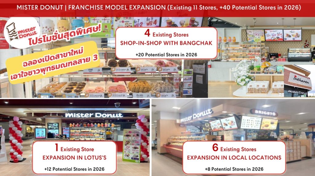 CRG ยังใช้โมเดลธุรกิจแบบใหม่ ๆ ช่วยขยายการเติบโตของแบรนด์ เช่น การเติบโตของโมเดลธุรกิจแบบแฟรนไชส์ของแบรนด์ MISTER DONUT ที่มีอยู่แล้ว 11 สาขา และพร้อมขยายเพิ่มอีก 40 สาขา ในปี 2569 นี้ ทั้งในรูปแบบ Shop in Shop ที่ปั๊มบางจาก การขยายสาขาในห้าง Lotus’s และการขยายสาขาในพื้นที่เมืองรอง และทำเลที่มีศักยภาพในย่านชุมชนท้องถิ่น